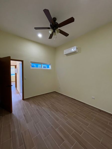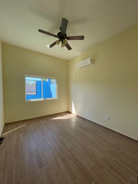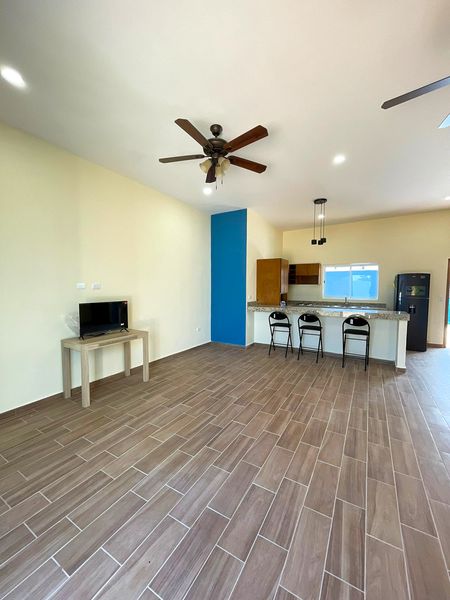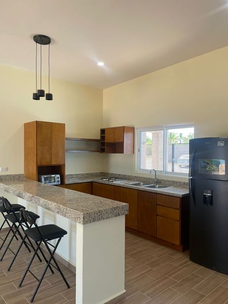 cocina integral con cubierta de granito y parrilla, además de persianas en todas las áreas, lavadora, refrigerador y televisión, aire acondicionado, 5 abanicos de techo y boiler.