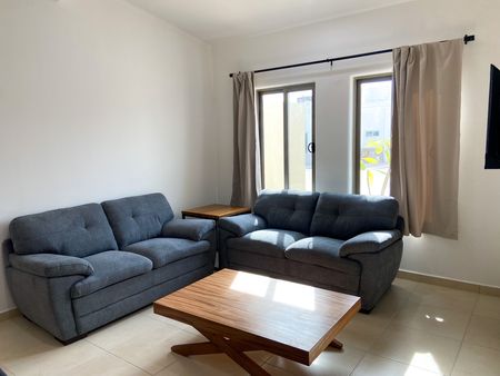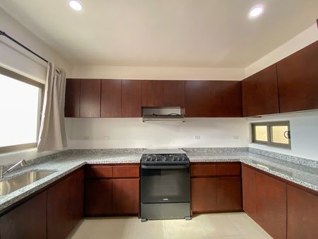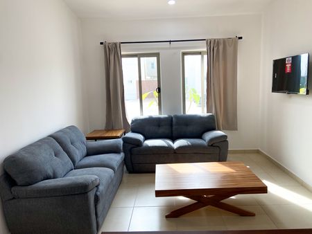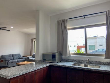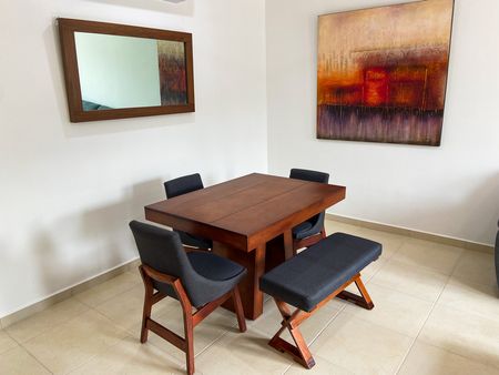 La propiedad se renta amueblada y equipada, incluyendo muebles de sala, comedor y cocina con electrodomésticos (refrigerador, estufa, campana y microondas), cortinas, ventiladores y aires acondicionados.
