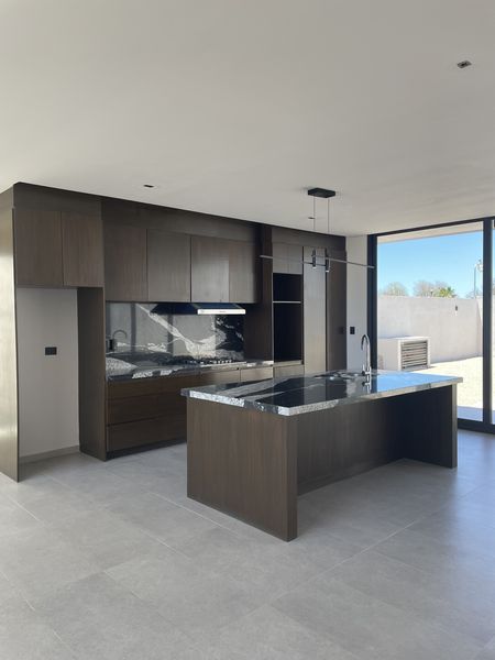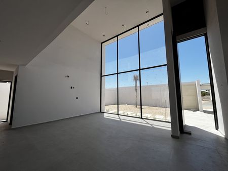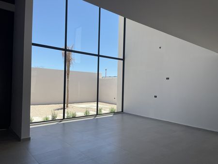 Sala a doble altura con ventanales de piso a techo, puerta principal carpintería en Madera de Parota, cocina integral equipado con estufa y extractor, medio baño en área social y cuarto de lavado.