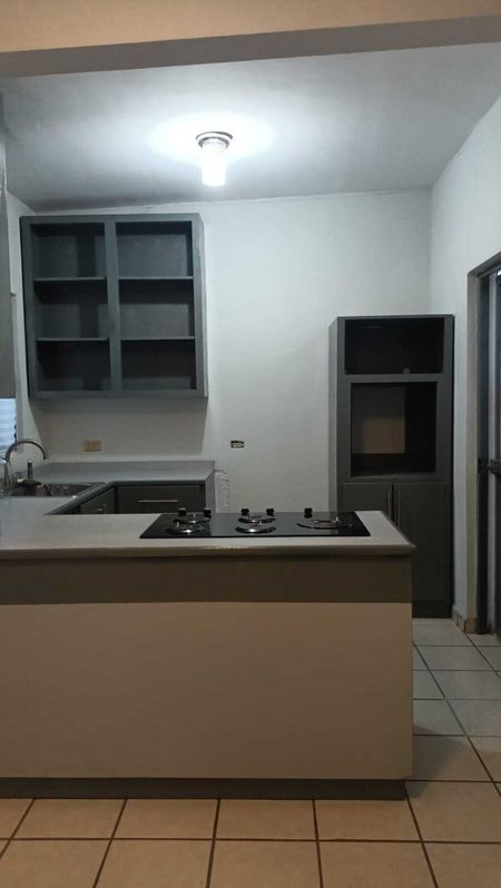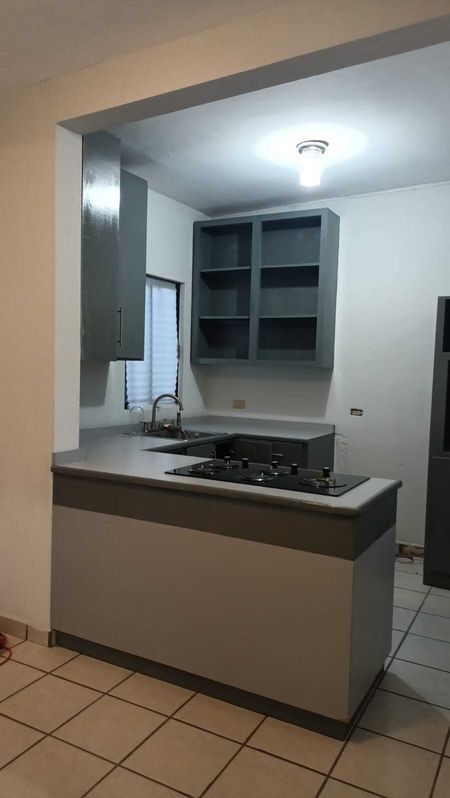 Cocina equipada, con estufa de gas, alacena (incluye el cilindro de gas grande).