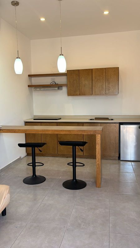 La cocina integral está diseñada para aprovechar al máximo el espacio, con una parrilla eléctrica y un frigobar, perfecta para tus necesidades diarias. Además, cuenta con una práctica barra que se convierte en un lugar ideal para disfrutar tus comidas o como un área de trabajo.