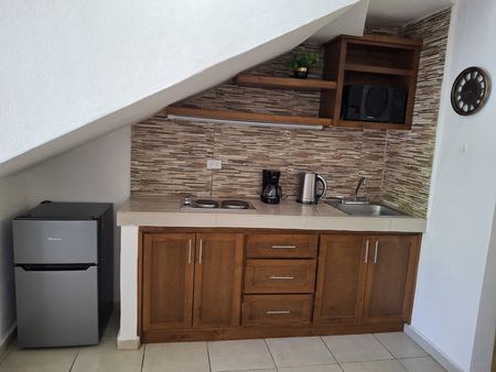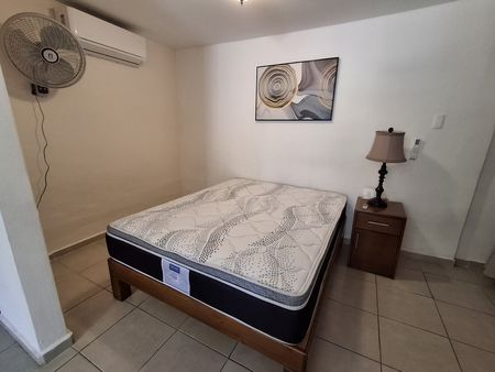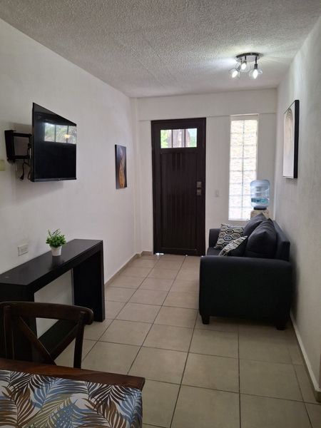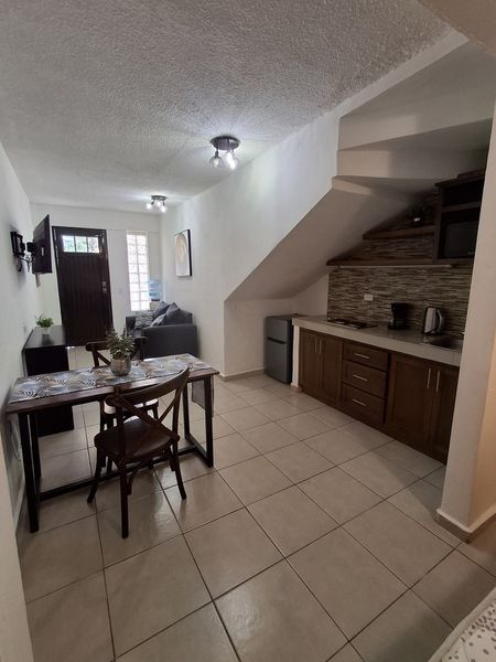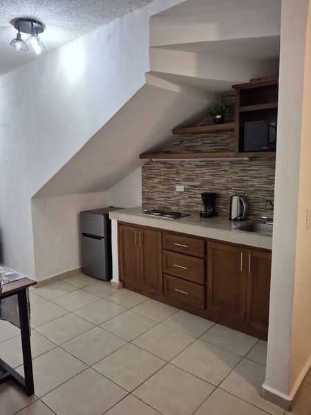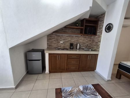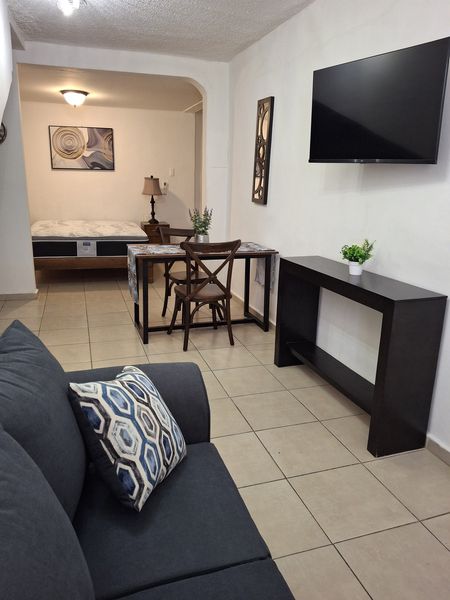 Este bonito departamento tiene una cama matrimonial, cocina, aire acondicionado, estufa eléctrica, microondas, frigobar, mesa para dos personas, TV, baño y pequeña area de closet, boiler eléctrico, además incluye area de lavado con lavadora y secadora en área común.