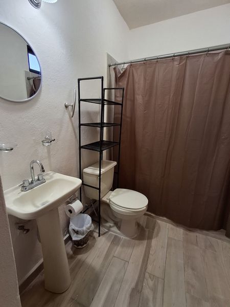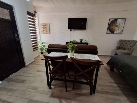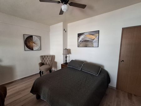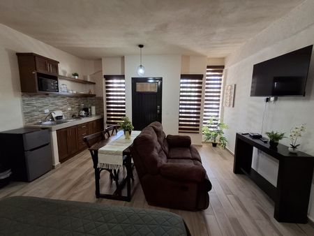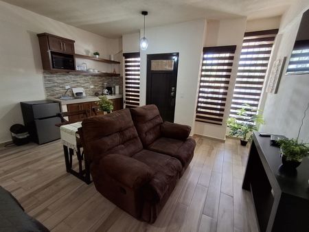 Este bonito departamento tiene una cama matrimonial, cocina, aire acondicionado, estufa eléctrica, microondas, frigobar, mesa para dos personas, TV, baño y pequeño closet, además incluye area de lavado con lavadora y secadora en área común.