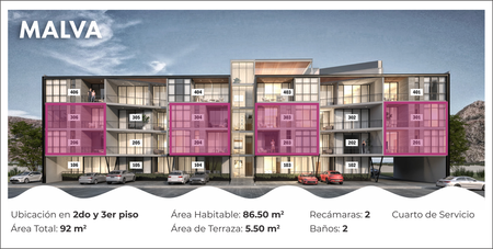 (-- El modelo MALVA Cuenta con 2 Recamaras, 2 Baños, 86.5 m2 habitables y 5.50 m2 de Terraza, su ubicación en el edificio podrá visualizarla en la imagen anexa con el numero de cada unidad. --)